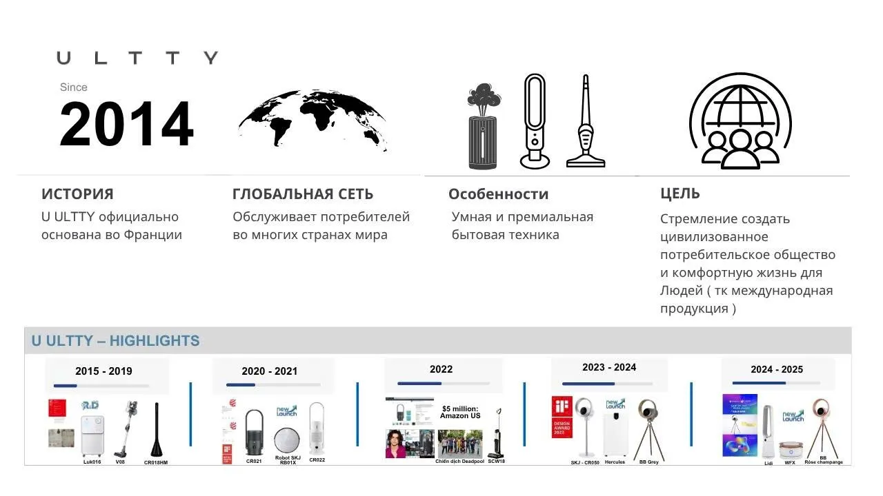 ULTTY регулярно участвует и демонстрирует продукцию на ведущих мировых технологических выставках, таких как IFA (Берлин, Германия) и CES (Чикаго, США), подтверждая своё лидерство в отрасли бытовой техники