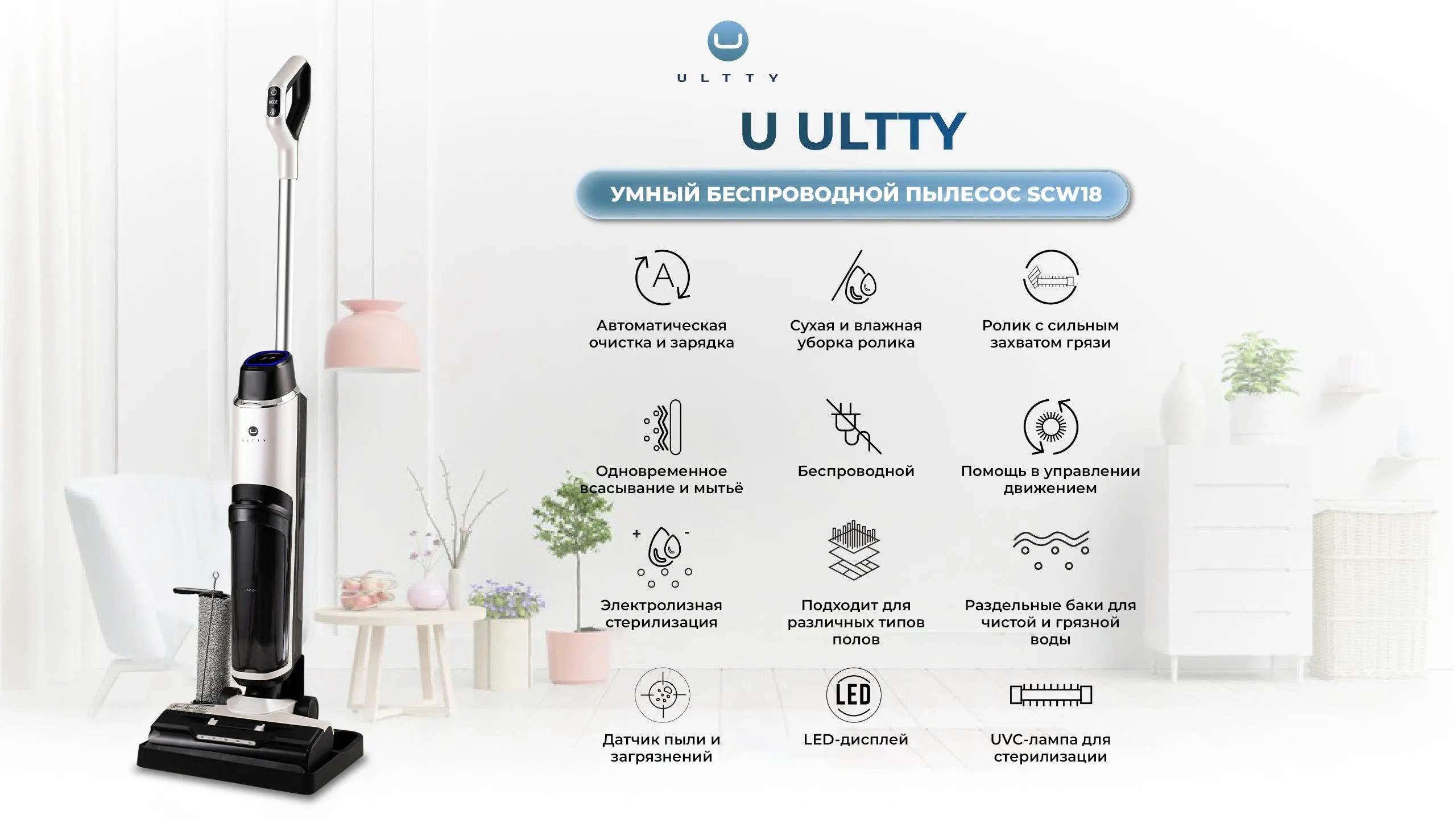 - Больше не нужно выбирать между всасыванием и мытьём пола — ULTTY SCW18 экономит время и силы, выполняя обе задачи одновременно и обеспечивая высокую эффективность уборки.