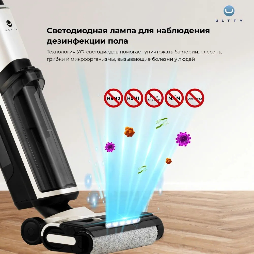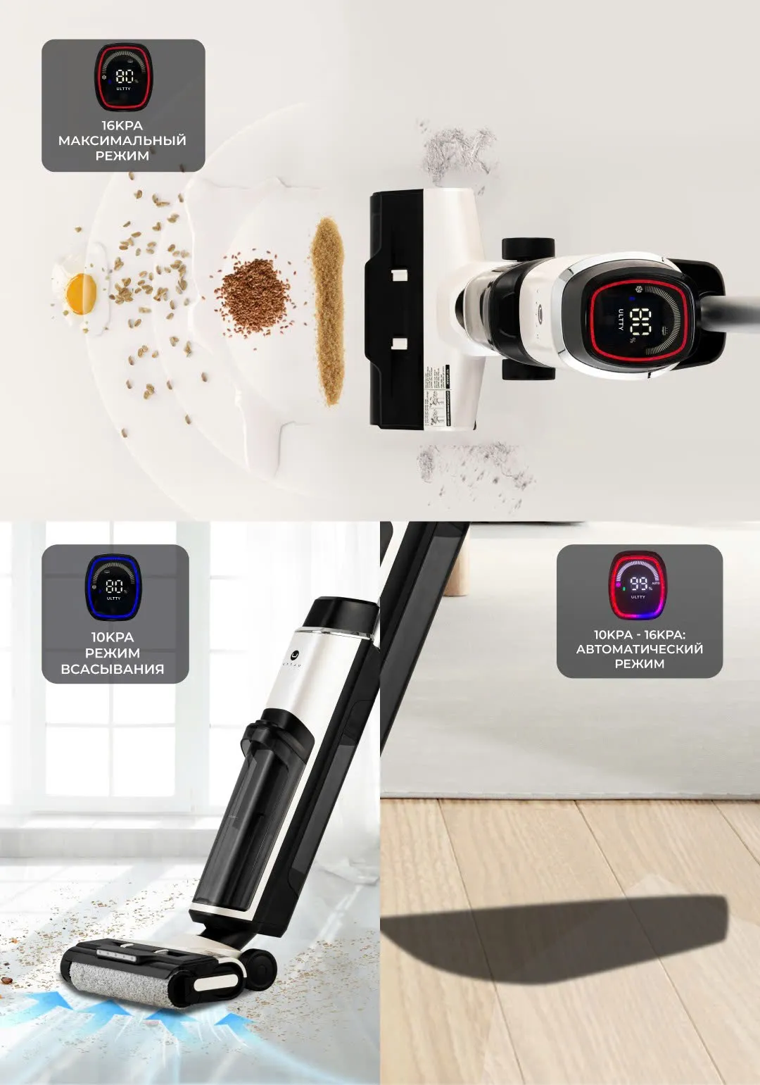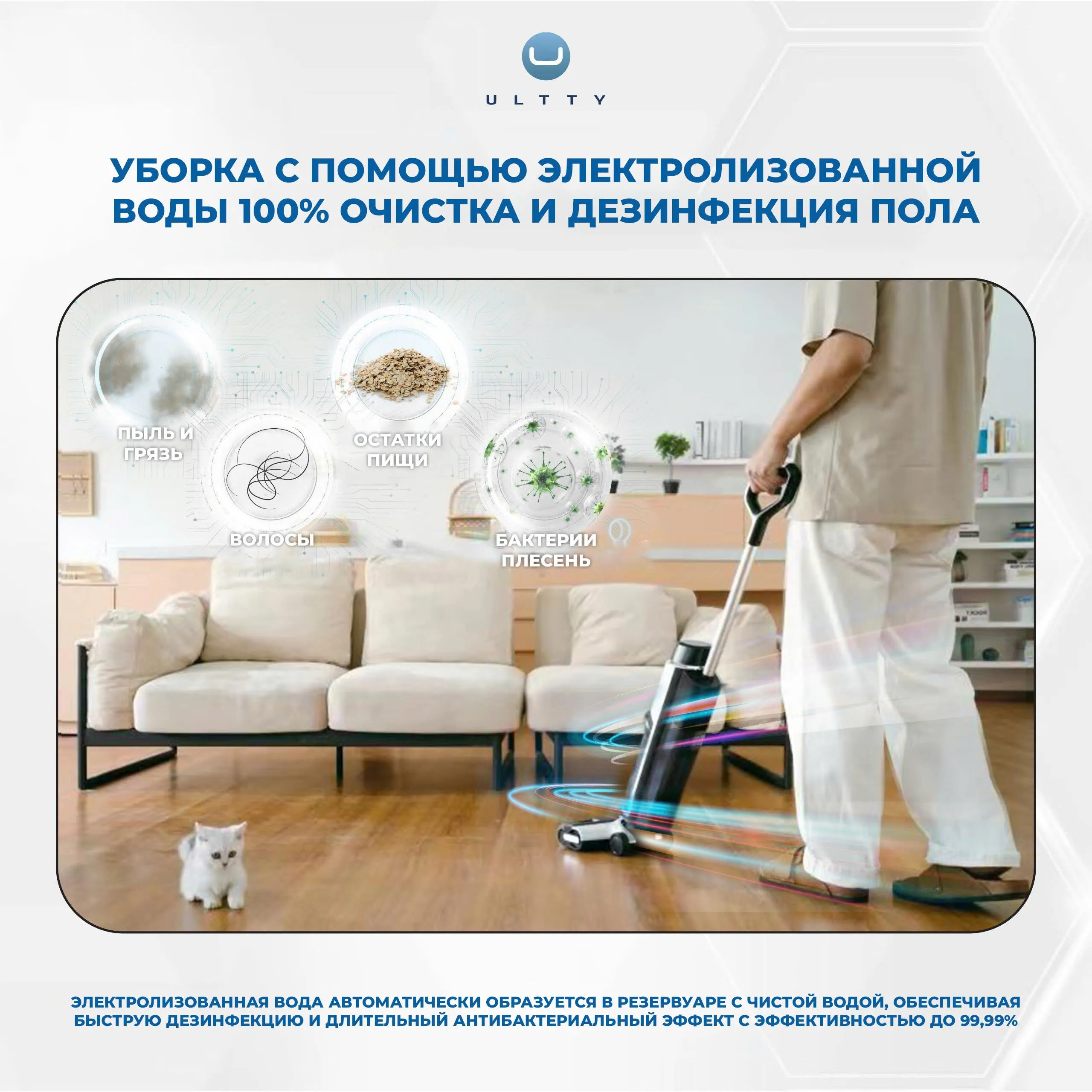 Интеллектуальный моющий пылесос ULTTY SCW18 с функцией 3 в 1, объединяющий всасывание, мытьё и стирку тряпки одновременно, обеспечивает уборку сухого и влажного пола за один проход, экономя время и силы.